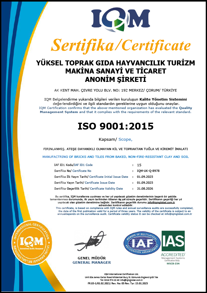 Öncelikli hedefi müşteri memnuniyeti olan firmamız, ISO 9001:2015 Kalite Yönetim Sistem Belgesini alarak bu konuda önemli bir adım atmıştır. Her konuda olduğu gibi bu yönüyle de sektöründe öncü olan firmamız TS EN 1304 standardına uygun ürün çeşitleri ve CE uygunluk beyanıyla üretimine devam etmektedir.